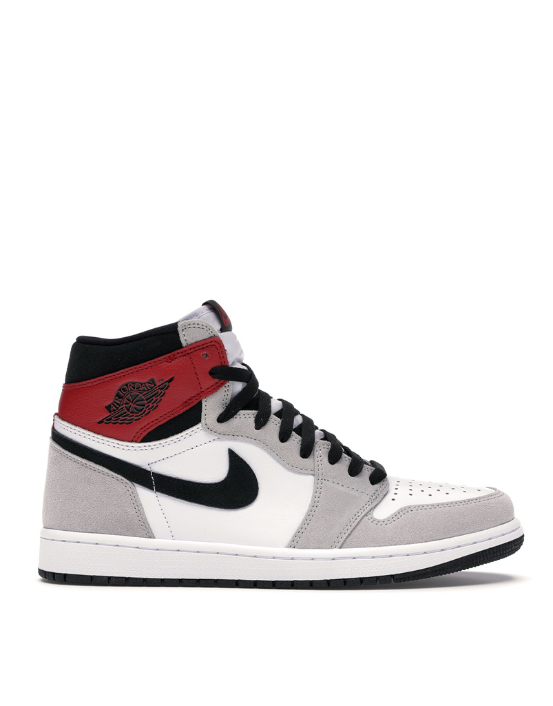 The Air Jordan 1 Retro High OG ‘Smoke Grey’ showcases a pop of Varsity Red on the ankle flap, stamped with a classic Jordan Wings logo on the lateral side. The rest of the upper is finished in strictly neutral tones, highlighted by a white leather base with grey suede overlays. A black Nike Swoosh is complemented by matching black hits on the collar and rubber outsole. Nike branding atop the white nylon tongue tag completes the OG aesthetic